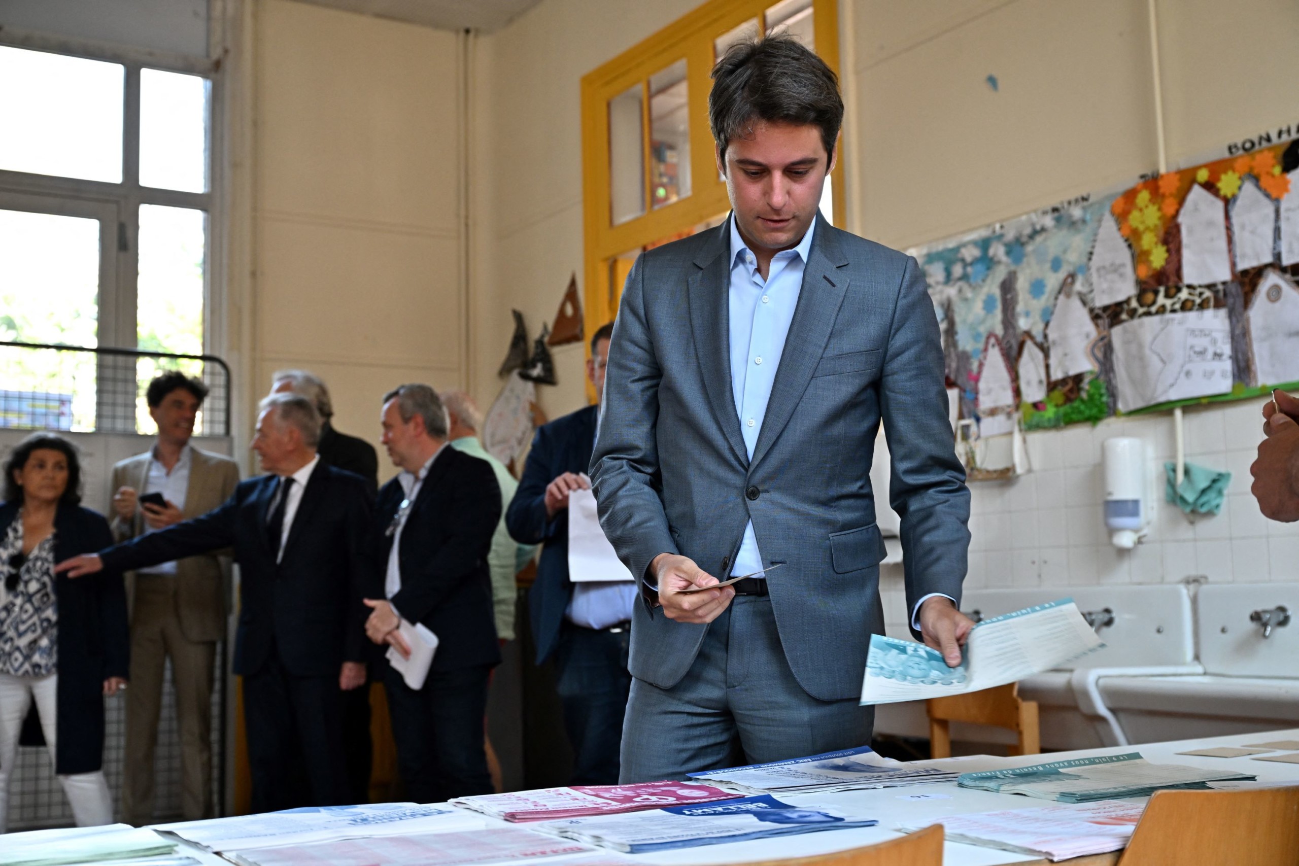 Gabriel Attal francia miniszterelnök leadja szavazatát az európai parlamenti választásokon a Párizs külvárosában lévő Vanves egyik szavazóhelyiségében 2024. június 9-én. Fotó: AFP