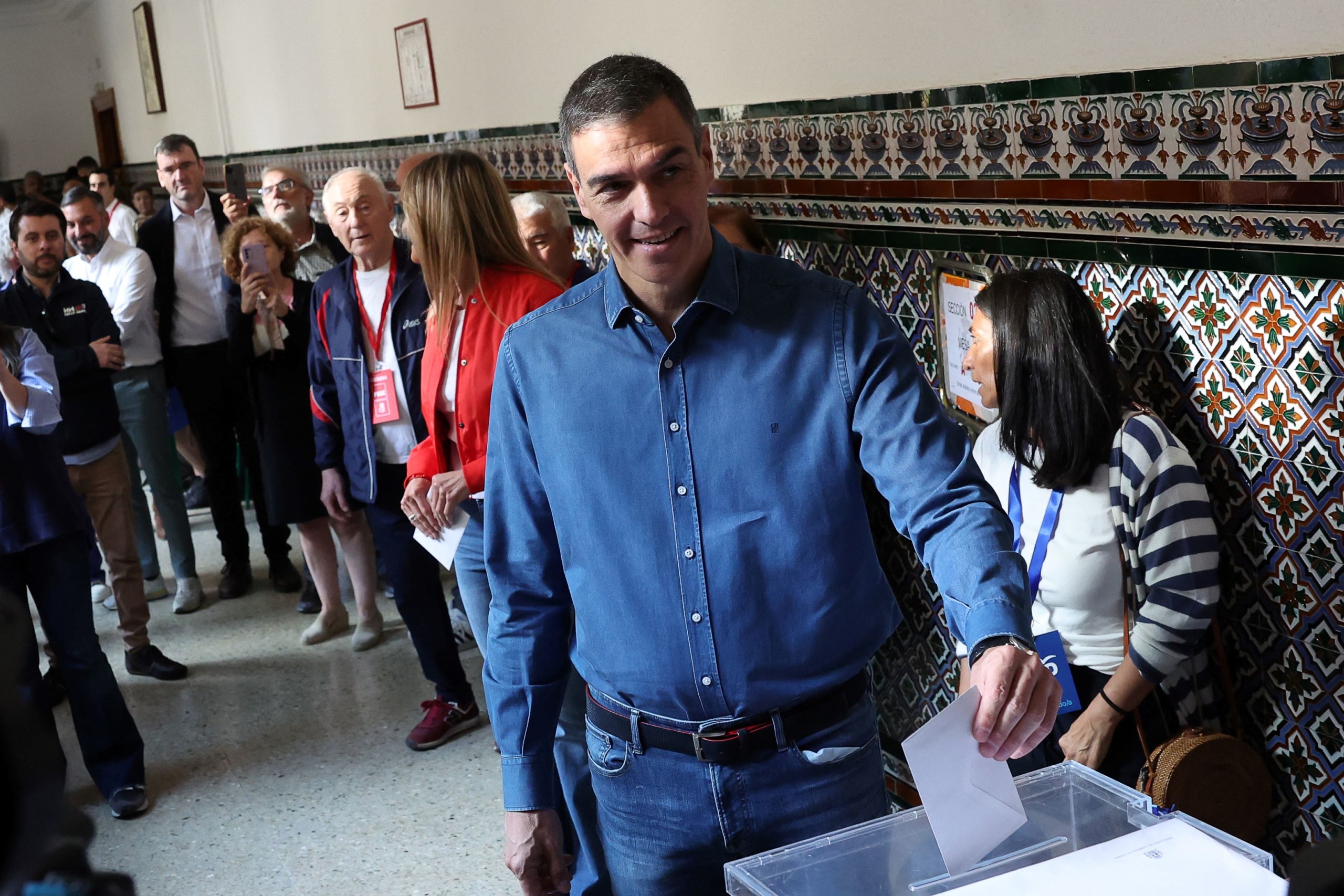 Pedro Sanchez spanyol miniszterelnök érkezik, hogy leadja szavazatát az európai parlamenti választásokon egy madridi szavazóhelyiségben 2024. június 9-én. Fotó: AFP