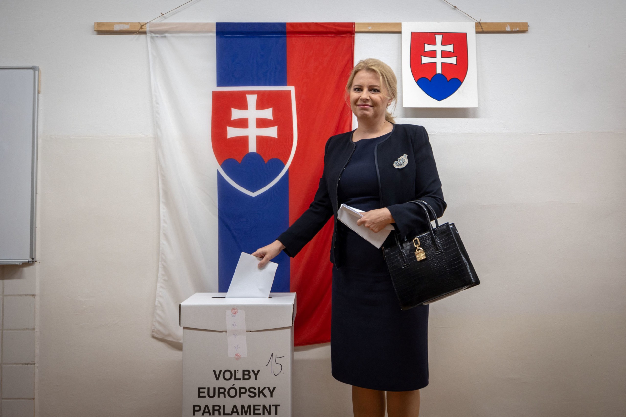 Zuzana Caputova szlovák köztársasági elnök leadja szavazatát a szlovákiai Pezinok egyik szavazóhelyiségében az európai parlamenti választásokon 2024. június 8-án, Robert Fico miniszterelnök elleni merénylet árnyékában. A szlovákok 15 képviselőt küldenek Brüsszelbe. Fotó: AFP
