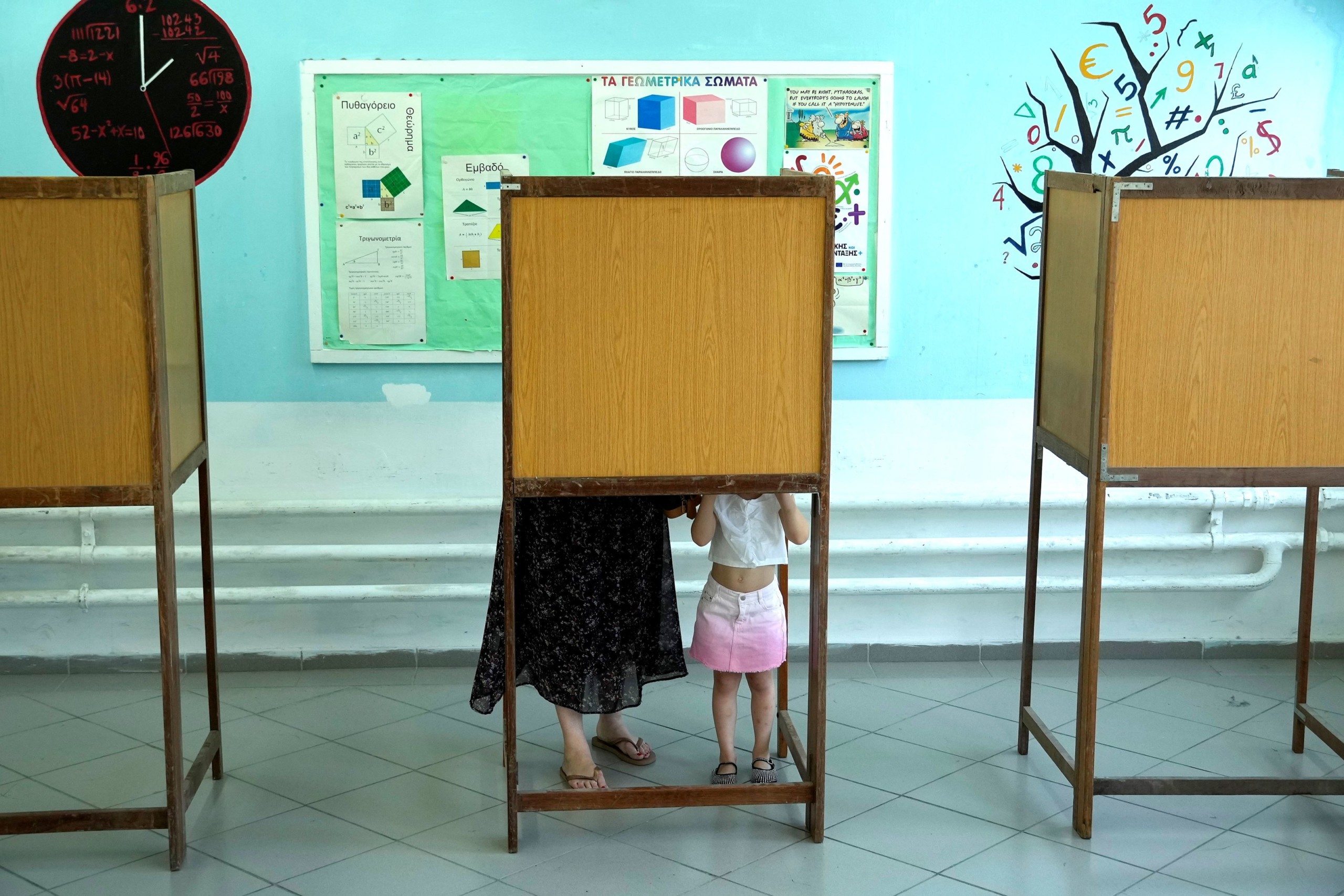 Voksoló nő kislánnyal az európai parlamenti és a helyhatósági választásokon a ciprusi fővárosban, Nicosiában 2024. június 9-én. Fotó: MTI/AP/Pétrosz Karadzsiasz