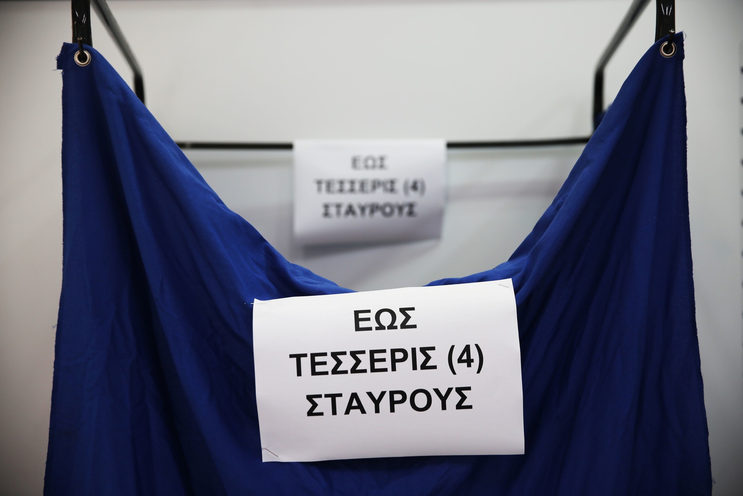 „Legfeljebb négy kereszt” jelentésű felirat egy szavazófülkén az európai parlamenti választásokon egy athéni szavazóhelyiségben 2024. június 9-én. Fotó: MTI/EPA/ANA-MPA/Alexandros Vlahosz