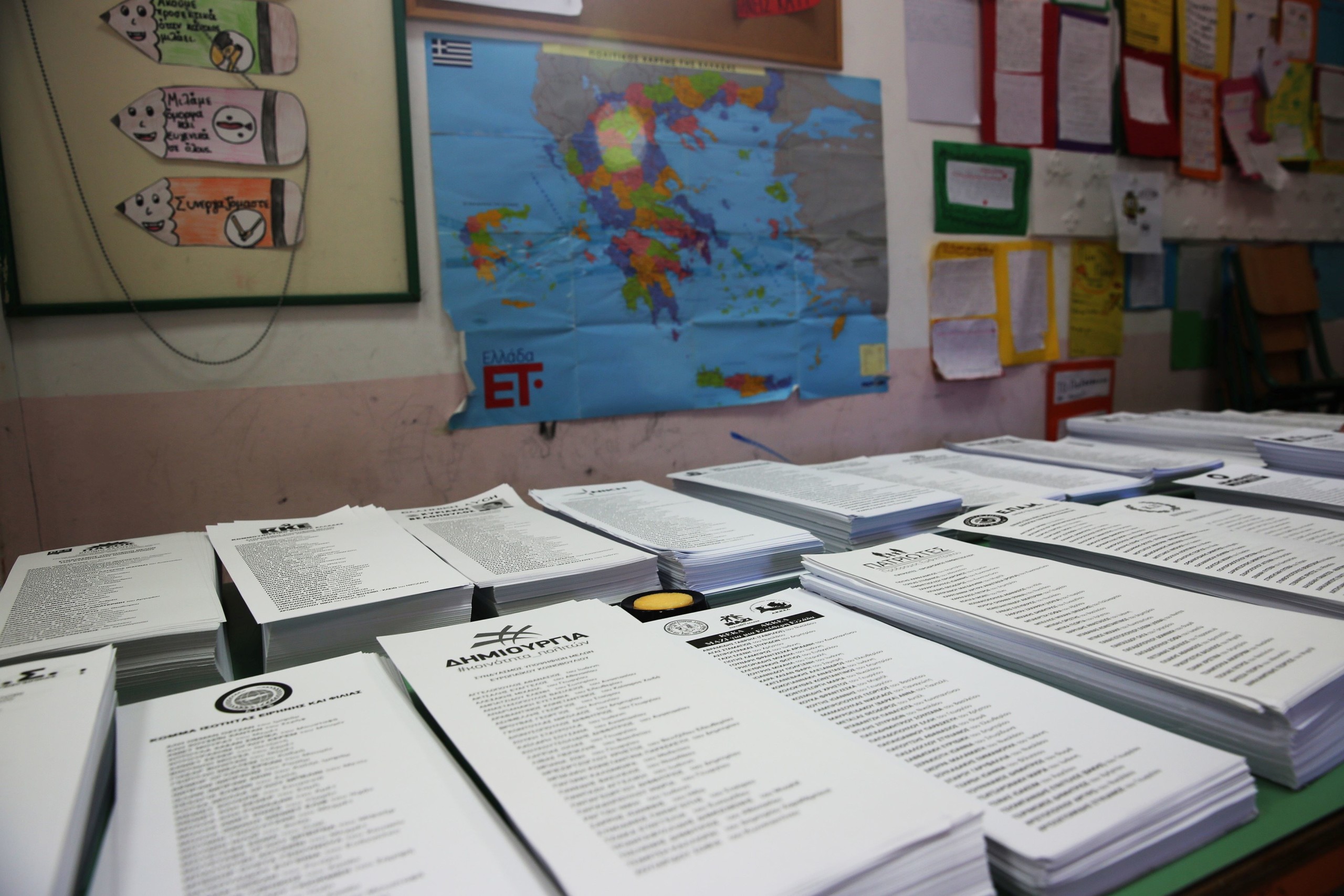 Szavazólapok az európai parlamenti választásokon egy athéni szavazóhelyiségben 2024. június 9-én. Fotó: MTI/EPA/ANA-MPA/Alexandros Vlahosz