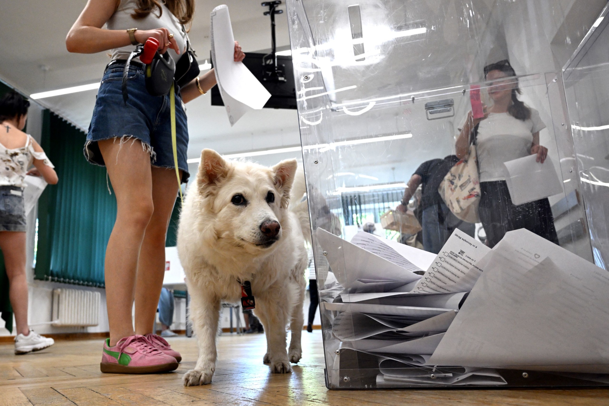 Kíváncsi kutya a lengyelországi választáson. Fotó: AFP