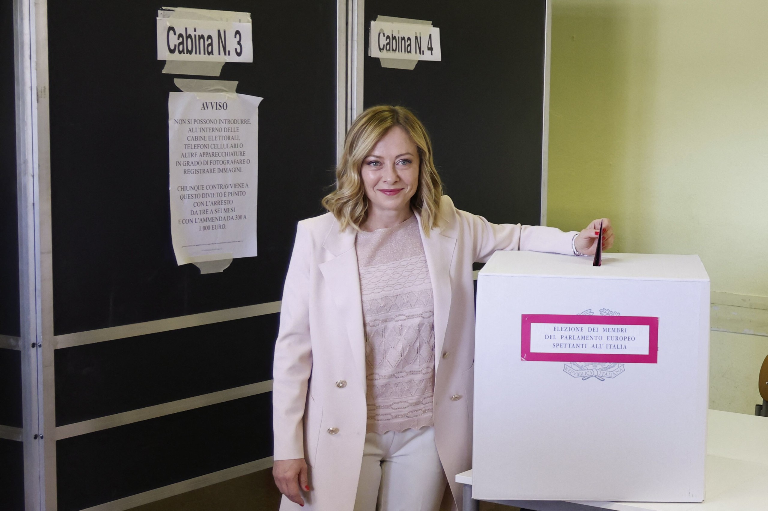 Giorgia Meloni olasz miniszterelnök és az olasz jobboldali párt, az Olasz Testvérek (Fratelli D'Italia - FDI) vezetője érkezik a szavazóhelyiségbe, hogy leadja szavazatát az európai parlamenti választásokon 2024. június 8-án Rómában. Fotó: AFP