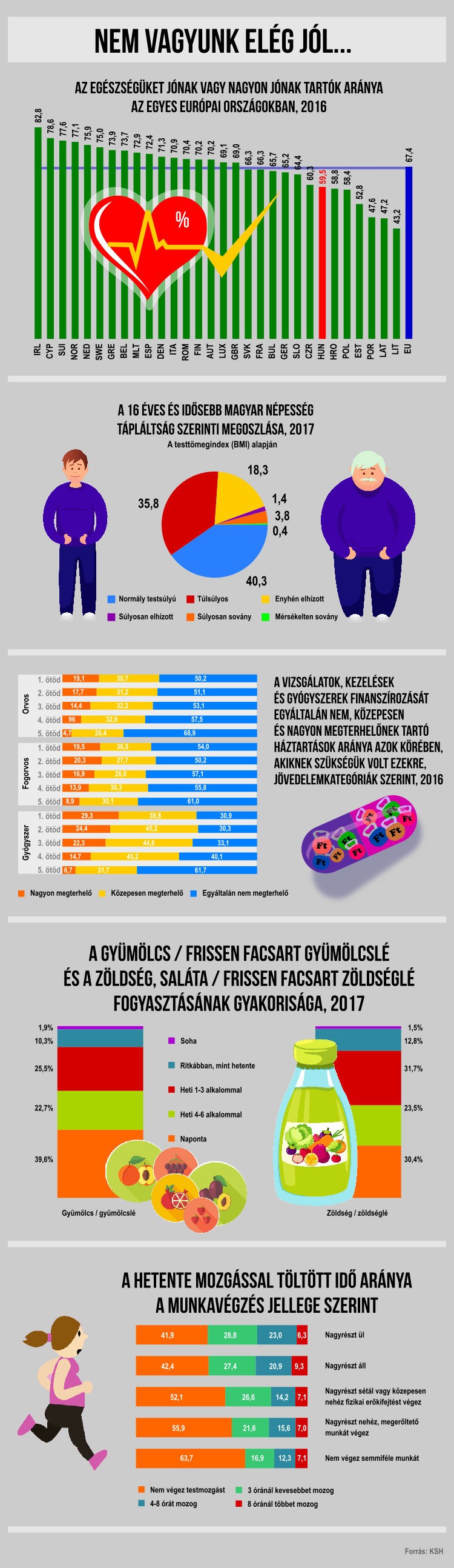 A Központi Statisztikai Hivatal (KSH) nemrég készített egy felmérést Egészségi állapot és egészségmagatartás 2016-2017 címmel, amelyben önbevallálos módszerrel vizsgálták a magyarok egészségi állapotát – írja a Házipatika. 2010 és 2015 között a megkérdezettek 55-56 százaléka tartotta jónak vagy nagyon jónak egészségi állapotát, majd 2016-2017-ben ez az arány 59-60 százalékra emelkedett, de még így is le vagyunk maradva az átlagtól.