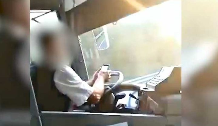 Felvétel a könyökével vezető, útközben telefont nyomkodó magyar buszsofőrről