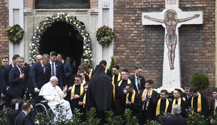 Ferenc pápa távozik az Istenszülő oltalma-templomból a budapesti Rózsák terén. Fotó: MTI/Balogh Zoltán