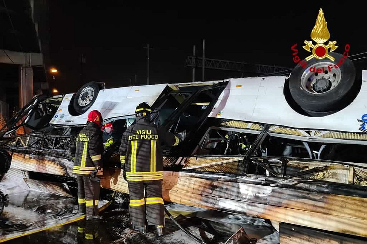 Legalább 21 ember életét vesztette Velence Mestre nevű városrészében kedd este történt súlyos buszbalesetben. A mentőegységek közlése szerint a halálos áldozatok között legalább öt ukrán, egy német, egy francia és egy horvát állampolgár van. Két gyermek és a busz 40 éves olasz sofőrje is meghalt. Az ingajáratban közlekedő elektromos busz egyelőre ismeretlen okokból áttörte a szalagkorlátot, mintegy 15 métert zuhant és a mestrei vasútállomás vágányaira esve akkumulátorai azonnal lángra lobbantak. A turistákat szállító magánbusz Velencéből indult egy margherai kempingbe, amikor leszaladt az útról. Az első jelentések szerint nem találtak féknyomokat, ami a jármű meghibásodására és a sofőr esetleges rosszullétére is utalhat. (Szöveg: MTI, fotó: AFP)