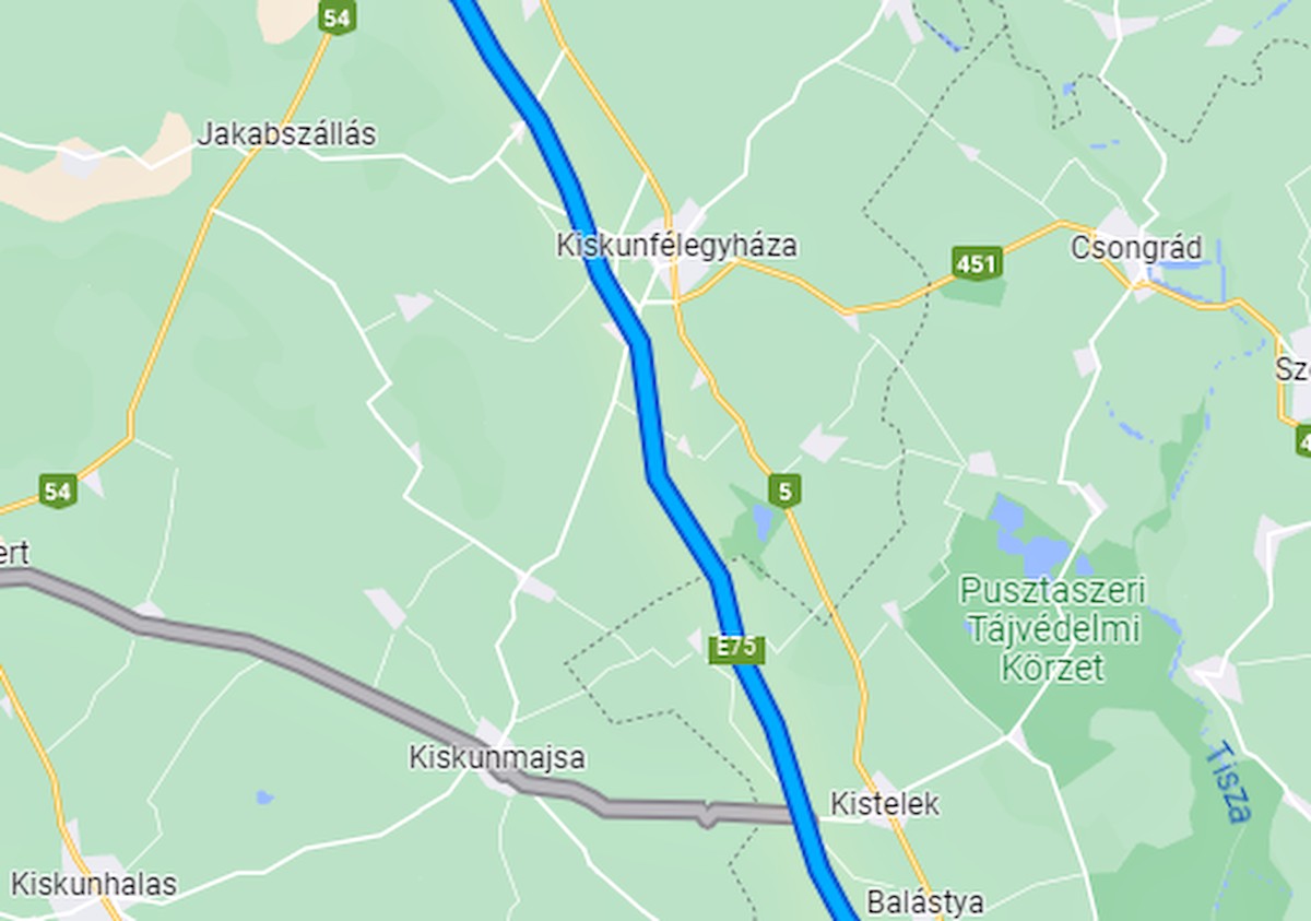 Az M5 autópálya Kiskunfélegyháza magasságában. Fotó: Google Térkép