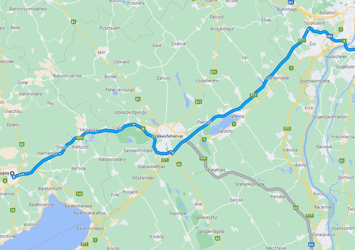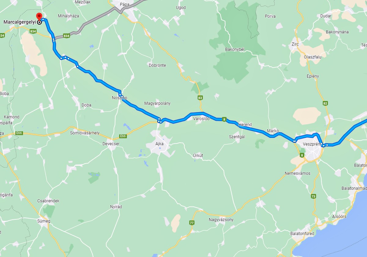 A szombati katonai konvoj vonulásának végső szakasza, Veszprém és Marcalgergelyi (Újmajor) térségében. Fotó: Google Térkép
