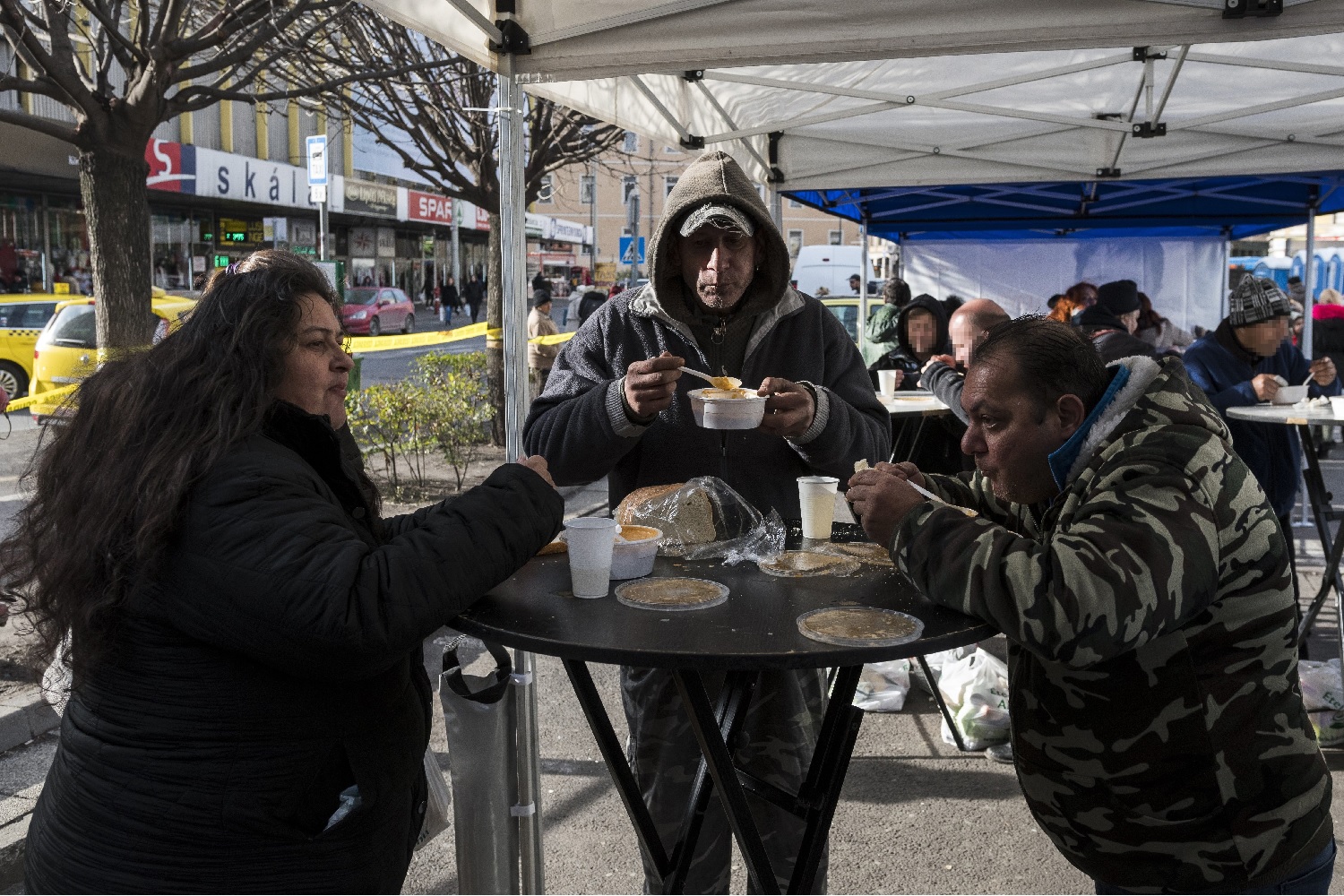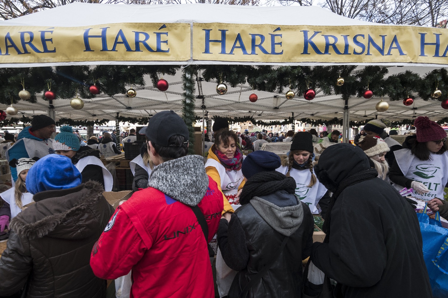 Ételosztást tartott a Blaha Lujza téren a Krisna-hívők humanitárius szervezete, az Ételt az Életért Alapítványa december 24-én. Már reggel 6-kor sorba álltak az emberek, pedig a karszalagot csak fél 9-től osztogatták.