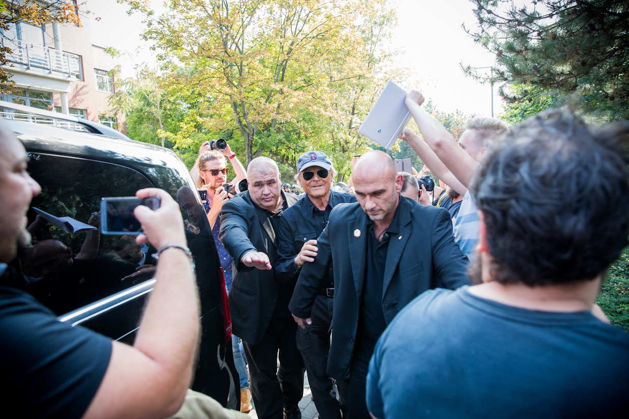 Csütörtökön a Centrál Médiacsoport székházához érkezett, nem is akárhogyan: több tucat Harley Davidsonos kísérte az épületig, amely egyébként a színész számára is meglepetés volt.