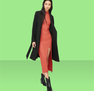 Nagyon jól mutat a korall ezen a hosszú, magas nyakú ruhán is, ami szinte ugyanaz az árnyalat, amit az év színének választottak a Pantone-nál: