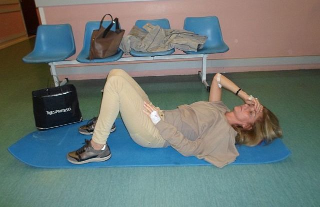 Az adatok rögzítése után az asszony órákig gerincfájdalommal ácsorgott a folyosón százkét társával együtt, mire sorra került, de ekkor már csak a földön fekve bírta ki. Az infúziót is így kapta, majd közel tízórás ottlét után sikerült távozniuk.