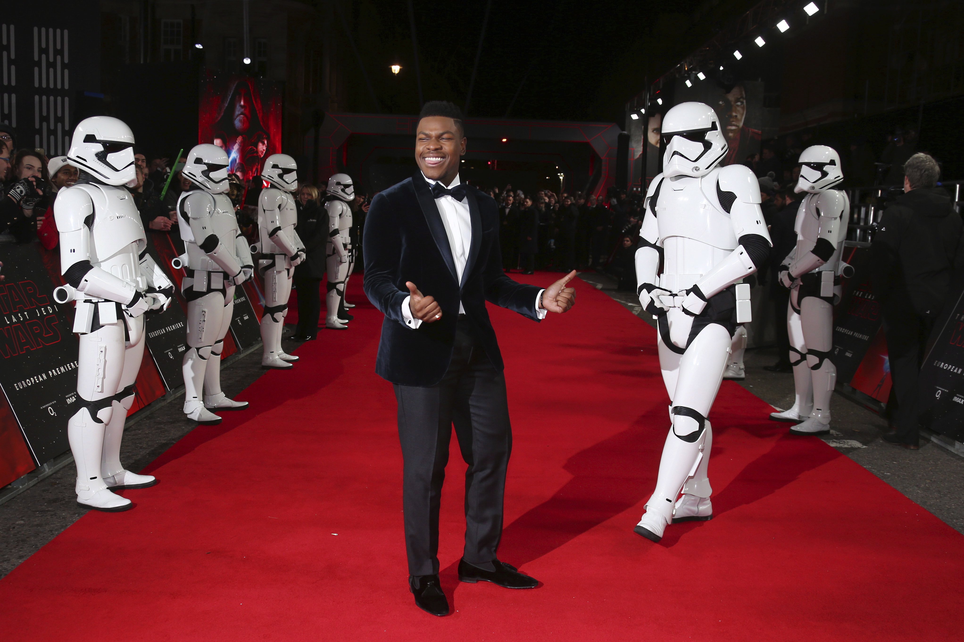 A film férfi főszereplője, John Boyega bársony öltönyében érkezett rohamosztagosok kíséretében: