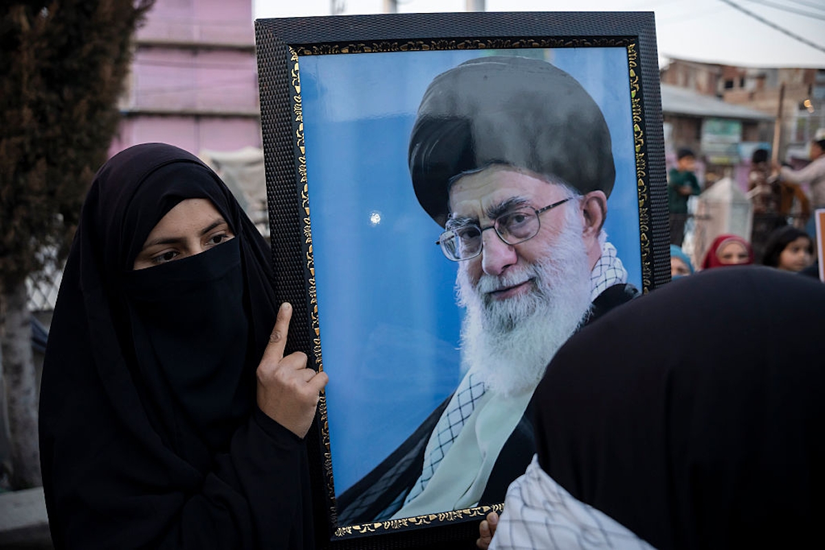 A protester hold a photograph of Ayatollah Ali Khamenei