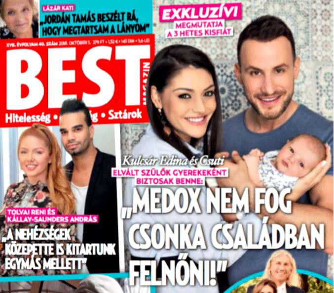 De most a BEST magazin címlapján már itt is az első közös családi fotó, amelyen büszkén mosolyog párja, Csuti oldalán, az apró Medox mellett.