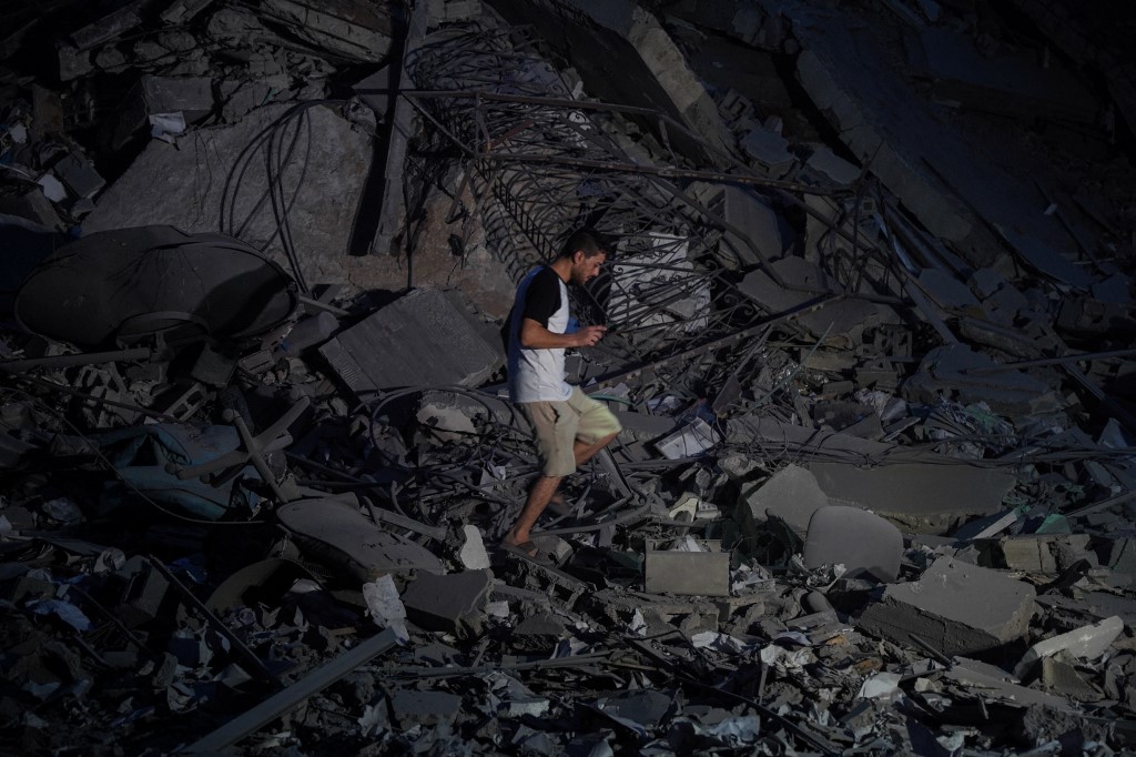 Egy férfi sétál egy izraeli légicsapás által eltalált épület romjai között Gáza városában. (Fotó: Saher Alghorra //via AFP)