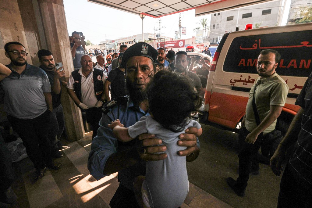 Egy palesztin férfi egy sérült kislányt cipel egy izraeli csapást követően a Gázai övezet déli részén fekvő Khan Juniszban 2023. október 14-én, amikor a harcok Izrael és a Hamász mozgalom között már a nyolcadik egymást követő napon folytatódnak. (Yasser Qudih/ AFP)