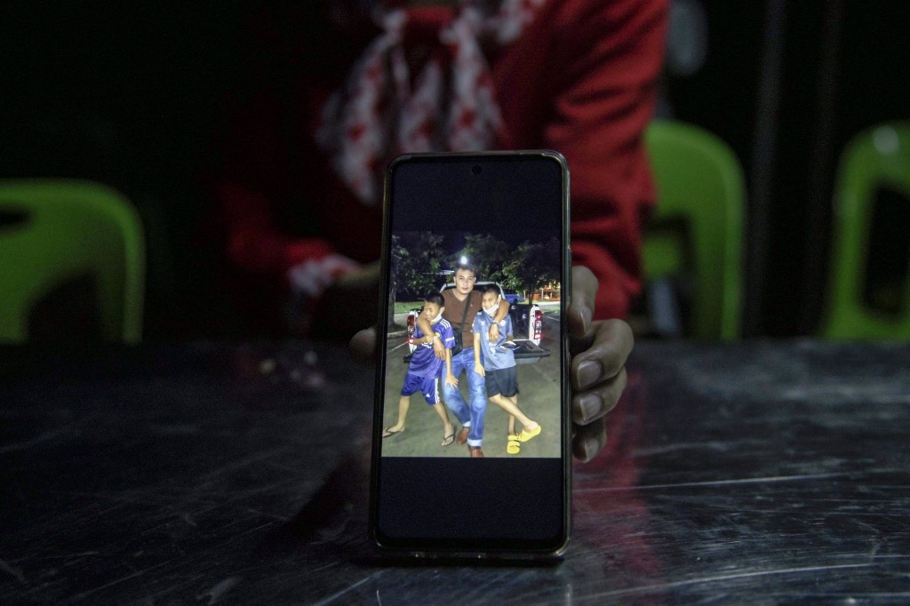 A 2023. október 13-án készült képen Kanyarat Suriyasri, a Hamász palesztin militáns csoport által Gázában túszként fogva tartott thaiföldi munkás, Owat Suriyasri felesége mutatja őt és két gyermeküket az AFP-nek adott interjú során a Thaiföld északkeleti Si Sa Ket tartományában található Kantharlakban. Fotó: Amaury PAUL / AFP