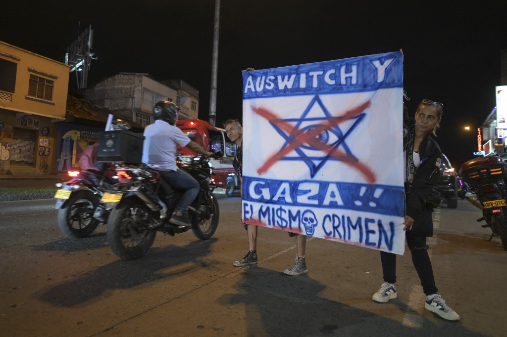 Egy férfi egy táblát tart a kezében: "Auschwitz és Gáza!!! Ugyanaz a bűntett" a palesztinok támogatására szervezett tüntetésen a kolumbiai Caliban 2023. október 13-án, a Gázai övezetet ért izraeli légicsapások közepette, amelyek a Hamász 2023. október 7-i meglepetésszerű támadásának megtorlásaként történtek.(Fotó: Joaquin Sarmiento/ AFP)