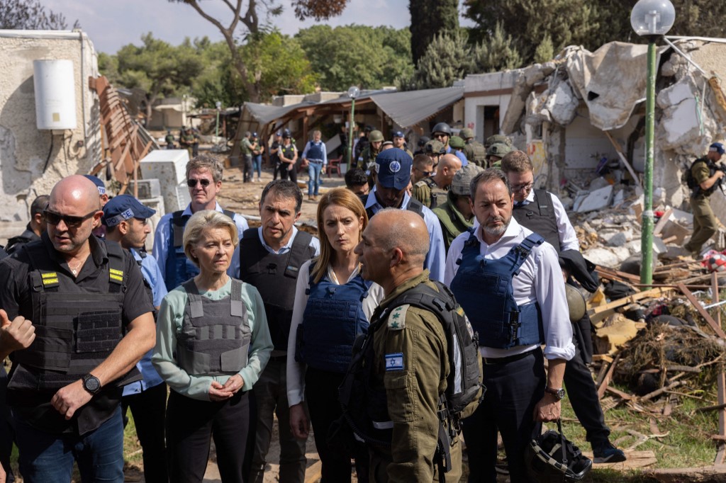 Izrael, Reim Kibbutz, 2023-10-13. Roberta Metsola, az Európai Parlament elnöke és Ursula von der Leyen, az Európai Bizottság elnöke látogatása a Reim Kibbutzban, valamint a YEZEHA egység nemzeti egységének látogatása és tájékoztatója Kfar Azzában. Fotó: Európai Unió/ Hans Lucas / AFP