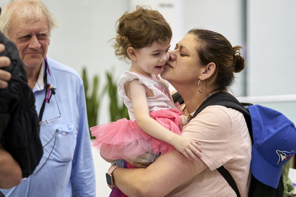 Kinneret Butterfield-Morrison köszönti gyermekeit, amikor ő és édesapja, Dave Butterfield (l.) a kanadai kormány Tel Avivból induló evakuációs járatán visszaérkezik Torontóba az Ontario állambeli Toronto Pearson repülőterén 2023. október 13-án. Kanada október 11-én két katonai repülőgépet küldött, hogy megbirkózzon a "megnövekedett igényekkel", és mintegy 700 kanadait repítsen haza "az elkövetkező napokban" - mondta Melanie Joly külügyminiszter. Több mint 4200 kanadai állampolgárt tartanak nyilván az ottawai konzuli szolgálatnál Izraelben, további 470-et pedig a palesztin területeken. (Geoff Robins / AFP fotója)
