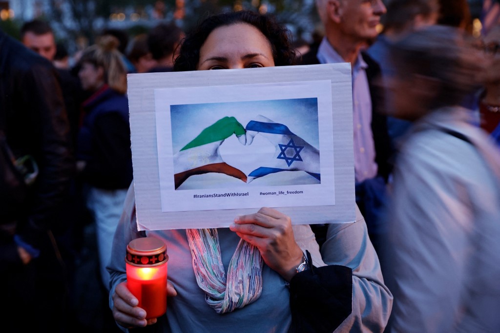 2023. október 13., Berlin: A berlini Fraenkelufer zsinagóga előtti virrasztáson egy résztvevő táblát tart a Hamász terrorja ellen és az Izraellel való szolidaritásért. Fotó: N: Carsten Koall/dpa