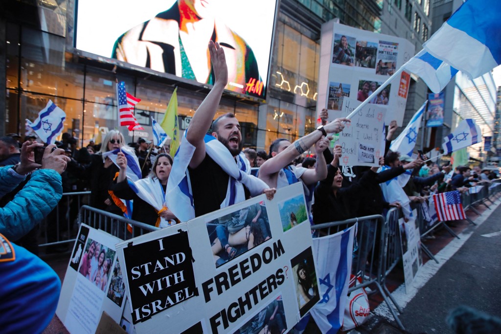 Izrael támogatói tüntetnek a New York-i Times Square-en 2023. október 13-án. (Fotó: Kena Betancur / AFP)