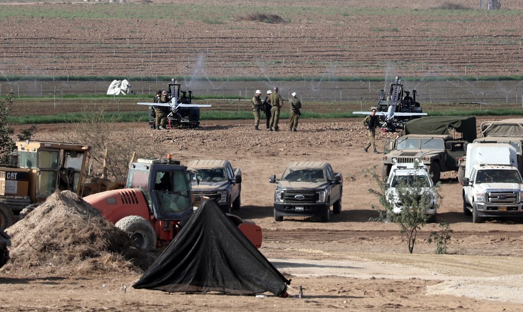 Izraeli katonák a palesztin Gázai övezet enklávéja közelében állomásozó fegyveres drónokat készítik elő a dél-izraeli Szderót város közelében lévő mezőn 2023. október 14-én, miközben a harcok Izrael és a Hamász mozgalom között már a nyolcadik egymást követő napon folytatódnak. (Thomas COEX / AFP fotója)