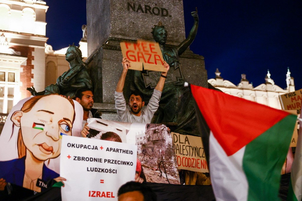 A palesztin diaszpóra tagjai és támogatóik zászlókat és transzparenseket tartanak a Palesztinával való szolidaritási tüntetésen a lengyelországi Krakkó főterén 2023. október 13-án. (Fotó: Beata Zawrzel/NurPhoto)