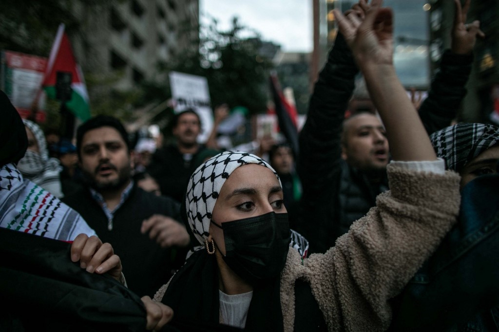 Emberek palesztin zászlókkal és transzparensekkel vesznek részt egy palesztinbarát tüntetésen, miközben Montreal belvárosából a palesztinok támogatására Izrael főkonzulátusa elé vonulnak a kanadai Montrealban 2023. október 13-án. Fotó: Amru Salahuddien / Anadolu