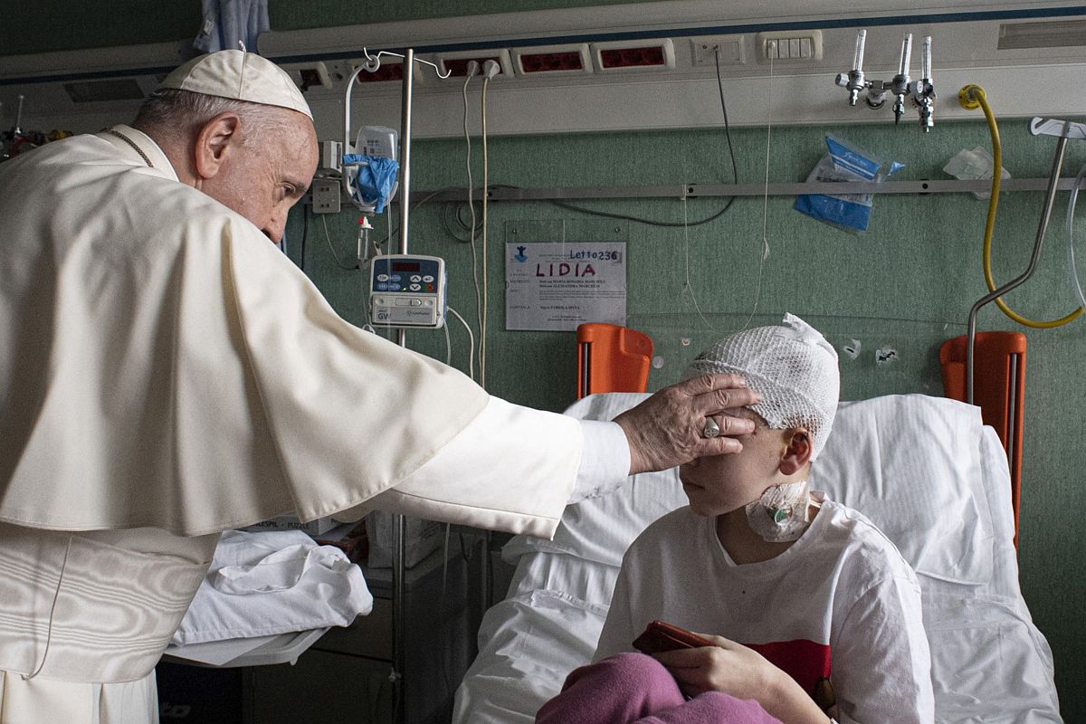 A vatikáni gyermekkórházban tett látogatást Ferenc pápa, ahol az ukrajnai háború elől menekülő betegekkel és sebesültekkel találkozott, írja a BBC. A harcok kirobbanása óta mintegy 50 ukrajnai gyermeket kezeltek a Bambino Gesù Gyermekkórházban, jelenleg tizenkilenc betegről gondoskodnak. (24.hu)