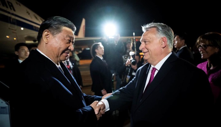 A Miniszterelnöki Sajtóiroda által közreadott képen Orbán Viktor miniszterelnök (j) fogadja Hszi Csin-ping kínai elnököt a Budapest Liszt Ferenc Nemzetközi Repülőtéren 2024. május 8-án. MTI/Miniszterelnöki Sajtóiroda/Benko Vivien Cher
