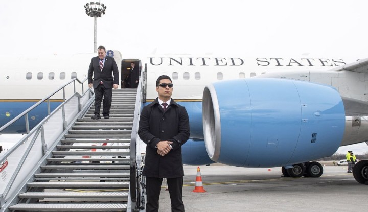 A Külgazdasági és Külügyminisztérium (KKM) által közreadott képen a hivatalos látogatásra érkezett Mike Pompeo amerikai külügyminisztert szállító repülõgép a Liszt Ferenc-repülõtéren 2019. február 11-én. (MTI/KKM/Kovács Márton)