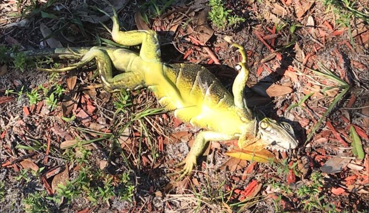 Az ott szabadon élő zöld leguánok 10 fok alatt elkezdenek elmerevedni, 5 fok alatt pedig már egyáltalán nem tudnak mozogni. Ez okozza azt, hogy sorra esnek le a fákról. Viszont amint melegebb van, újra magukhoz térnek.