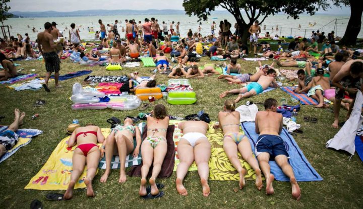 A Balatonon mindeközben már teljes a zsúfoltság a strandokon, de nem csak a pázsiton, hanem ahogyan az alábbi Időkép videóból is kiderül, már a vízben is.