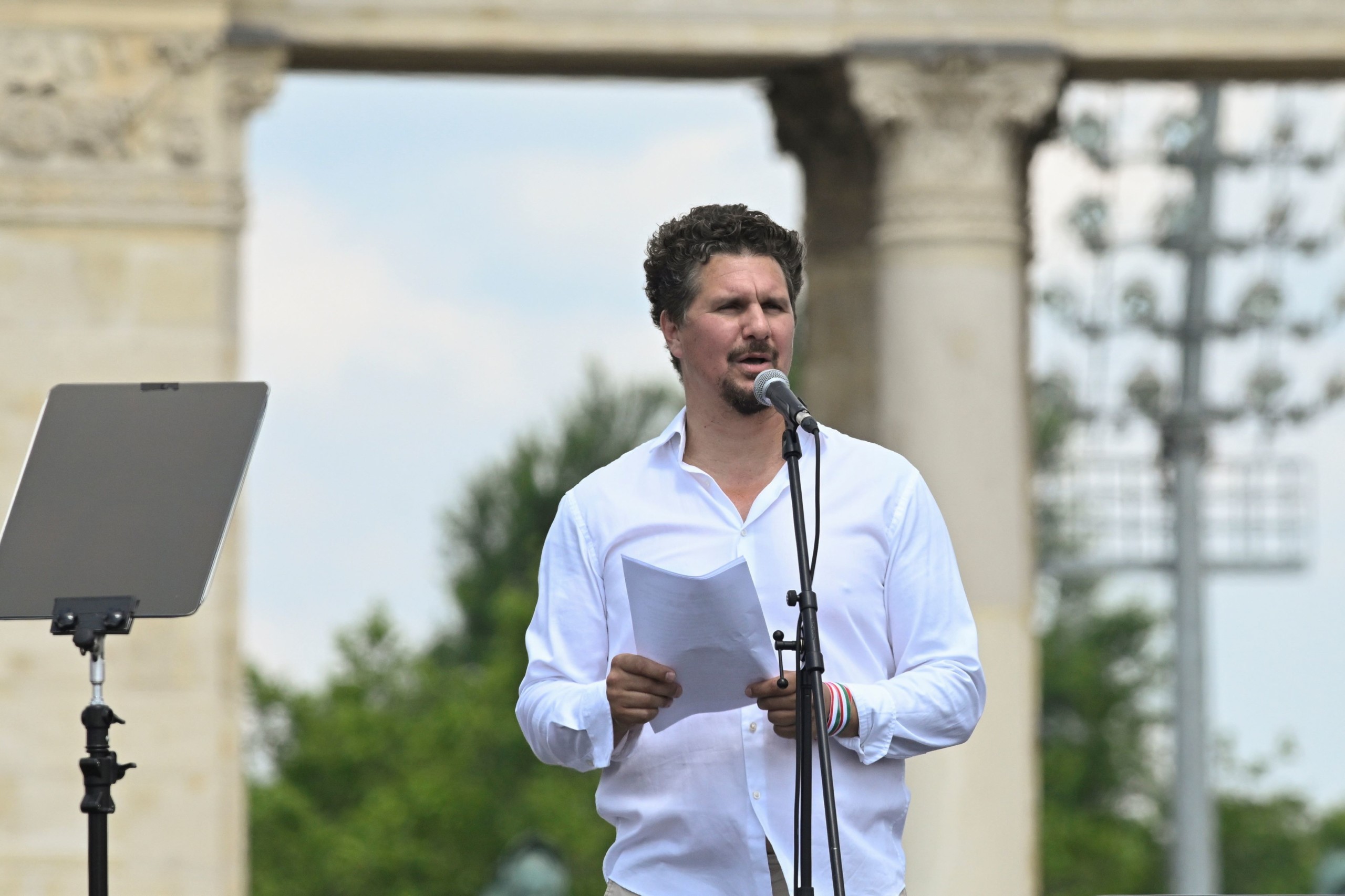 Azért vagyunk ma itt, hogy megüzenjük: nem fogunk lehajtott fejjel tűrni tovább, nincs hova hátrálnunk. Ez a mi hazánk! – mondta. Ria, Ria, Hungária – harsogja a tömeg.