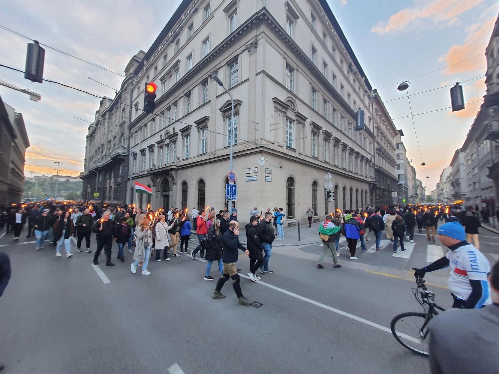 19.22 – A József Attila utca felé indul a tömeg, megkerülik a Belügyminisztériumot. Magyar Péter és Szilágyi Kitti vezetésével kihúztak egy “kék vonalat”, körbemennek az épület körül, a kék vonal végét szimbolikusan odaadják Pintér Sándornak, hogy hallja meg végre az áldozatokat.