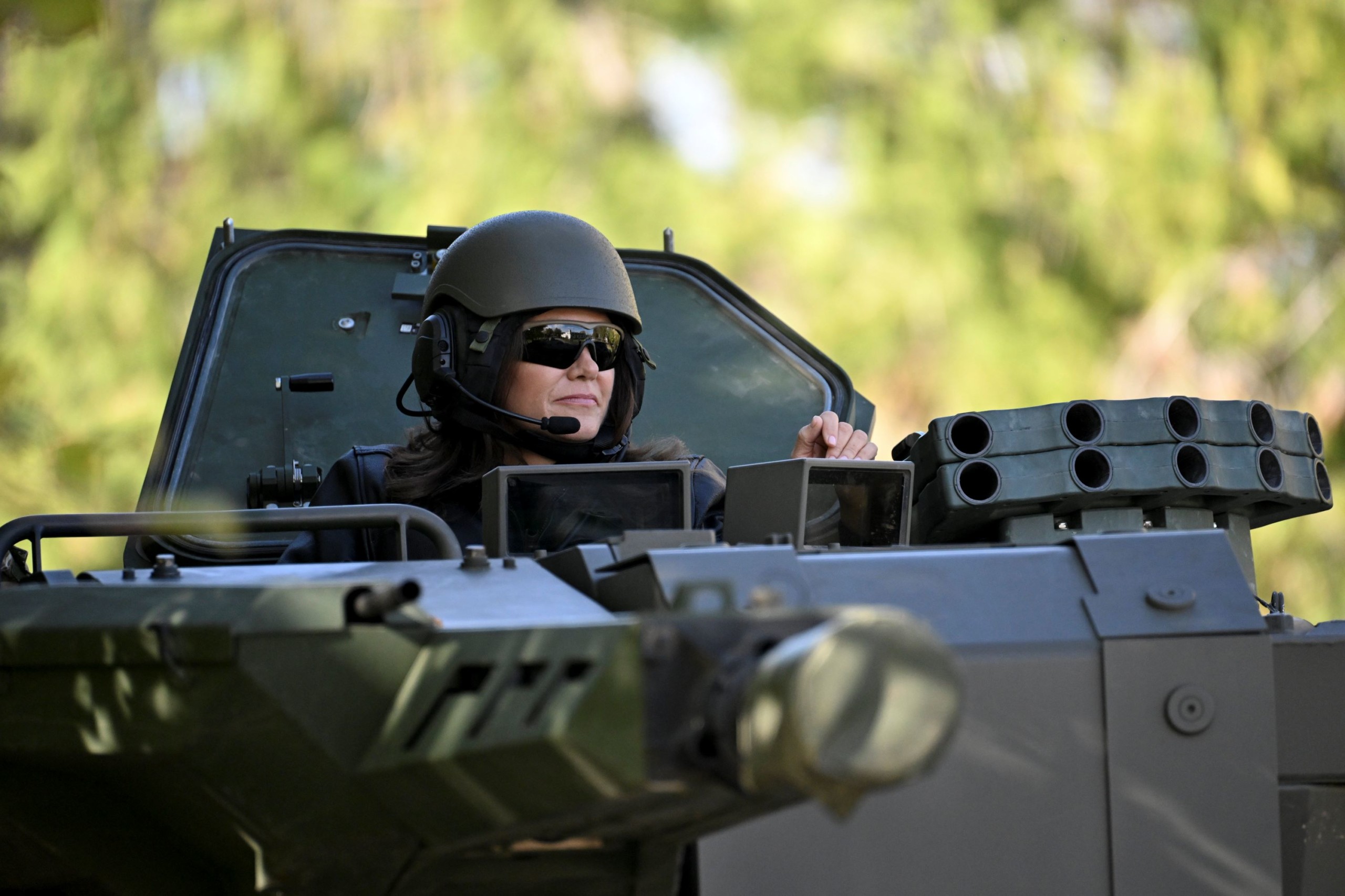 Novák Katalin köztársasági elnök, a Magyar Honvédség főparancsnoka egy Lynx páncélozott gyalogsági harcjárműben a NATO-erők részvételével megrendezett Adaptive Hussars 23 többnemzeti országos gyakorlat megnyitóján. Fotó: MTI/Koszticsák Szilárd