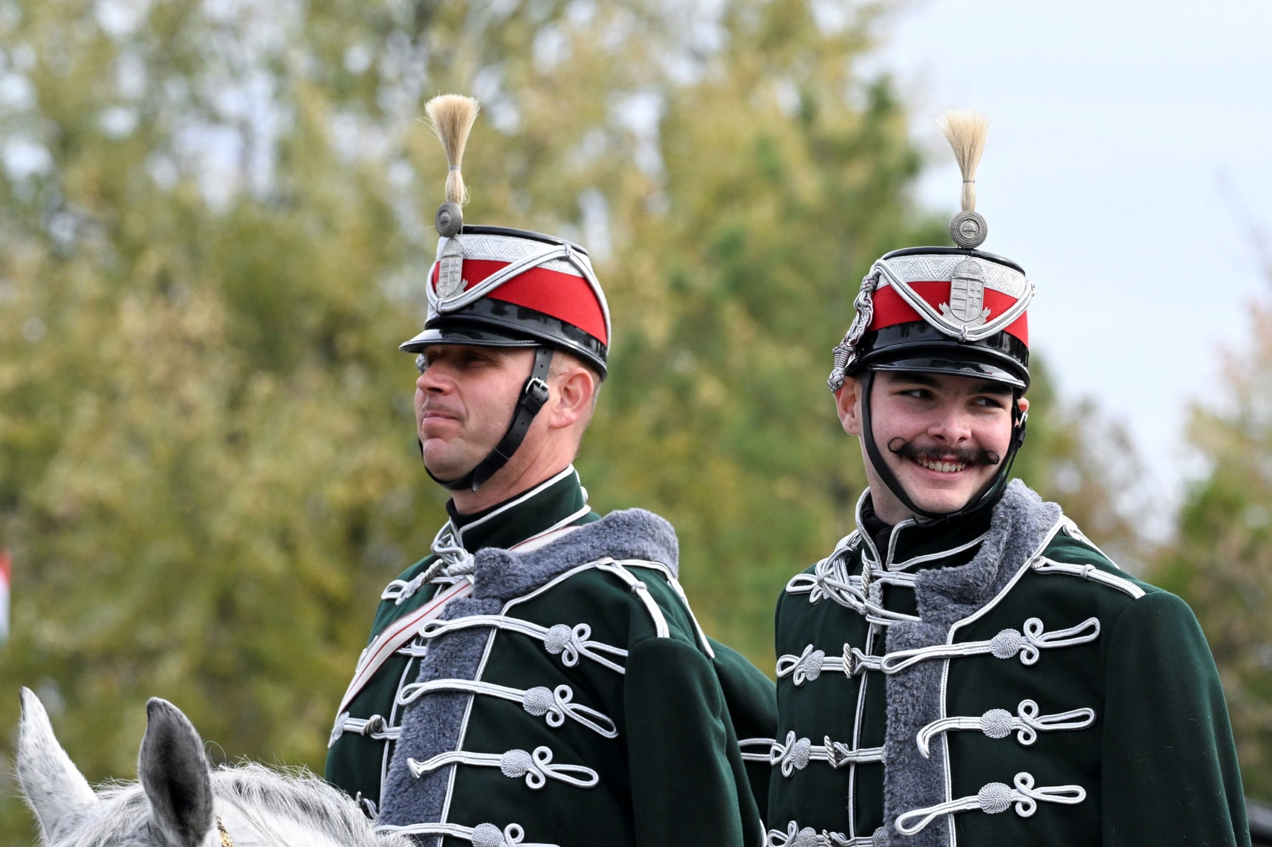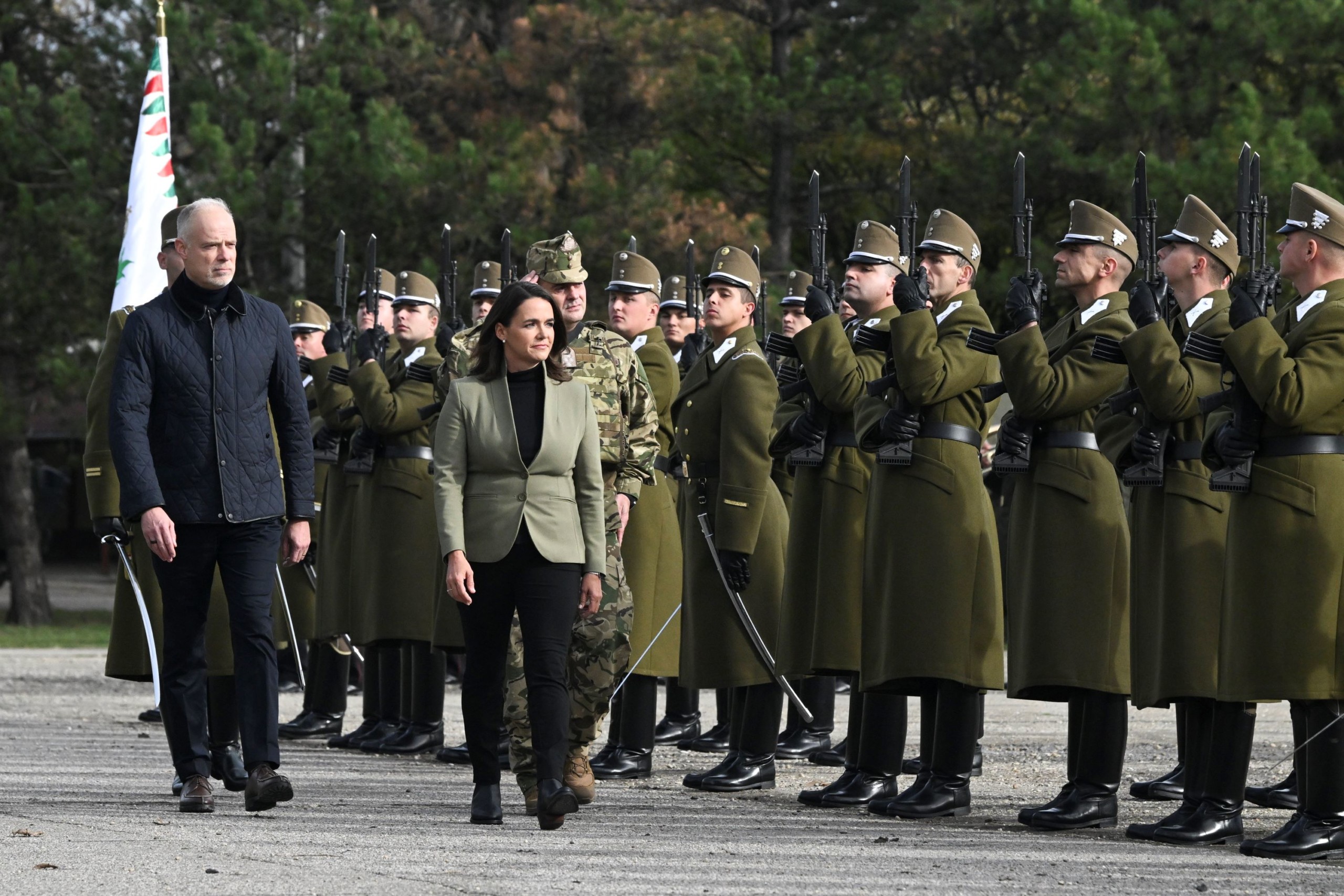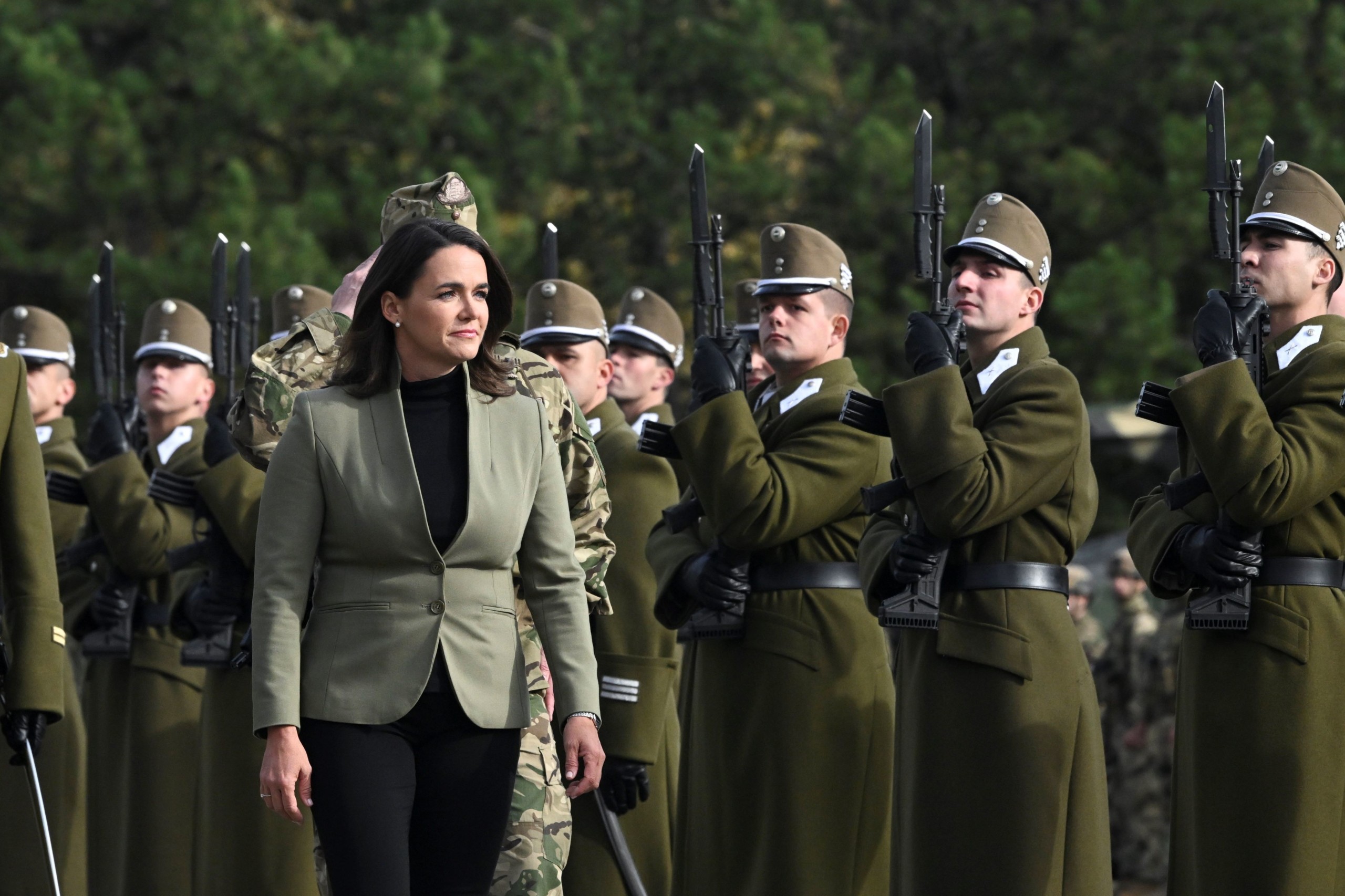 Katonai tiszteletadással fogadják Novák Katalin köztársasági elnököt, a Magyar Honvédség főparancsnokát a NATO-erők részvételével megrendezett Adaptive Hussars 23 többnemzeti országos gyakorlat megnyitóján a hódmezővásárhelyi Zrínyi Miklós Laktanyában 2023. november 7-én. Fotó: MTI/Koszticsák Szilárd