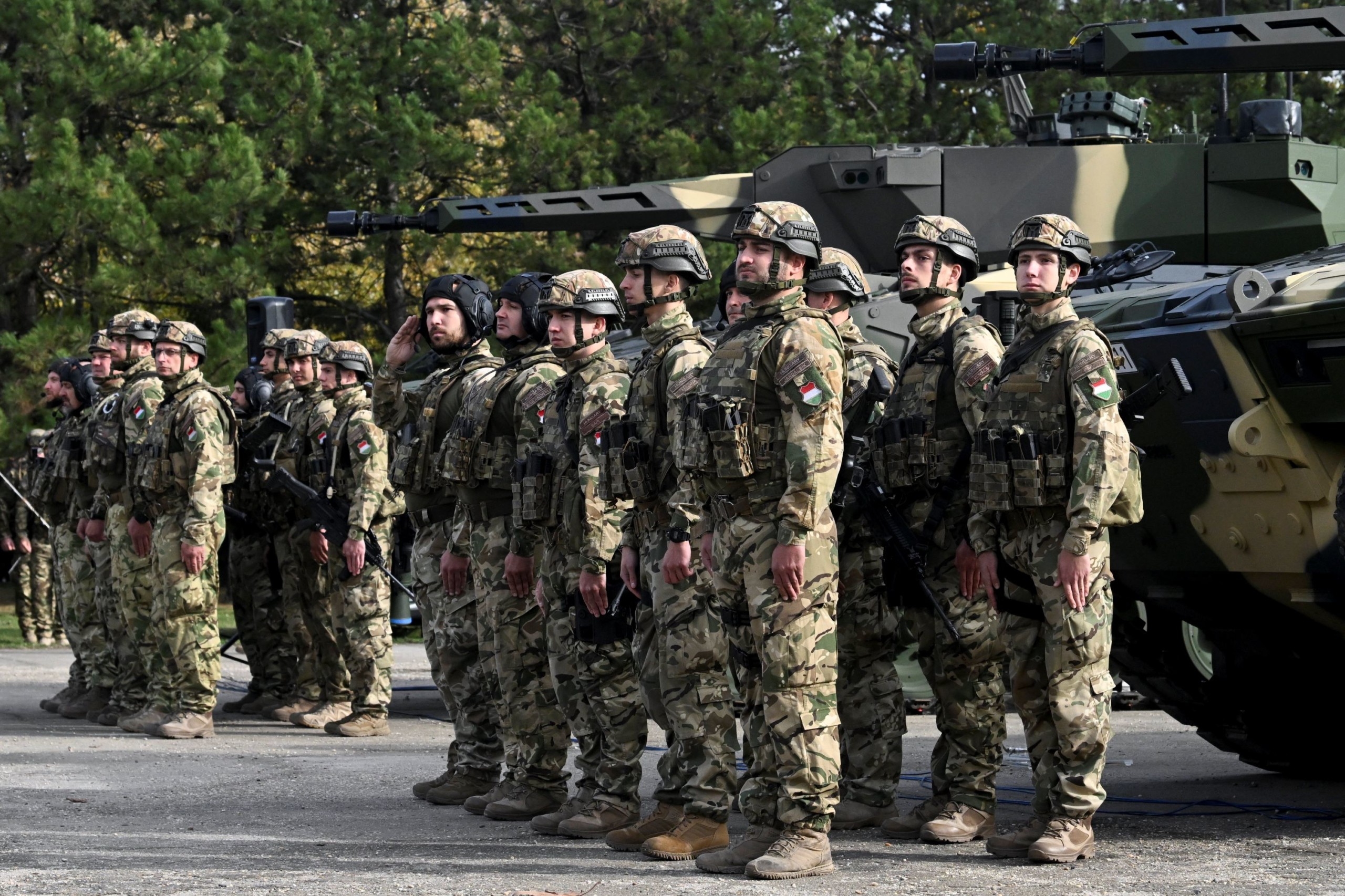Katonák a NATO-erők részvételével megrendezett Adaptive Hussars 23 többnemzeti országos gyakorlat megnyitóján a hódmezővásárhelyi Zrínyi Miklós Laktanyában 2023. november 7-én. Fotó: MTI/Koszticsák Szilárd
