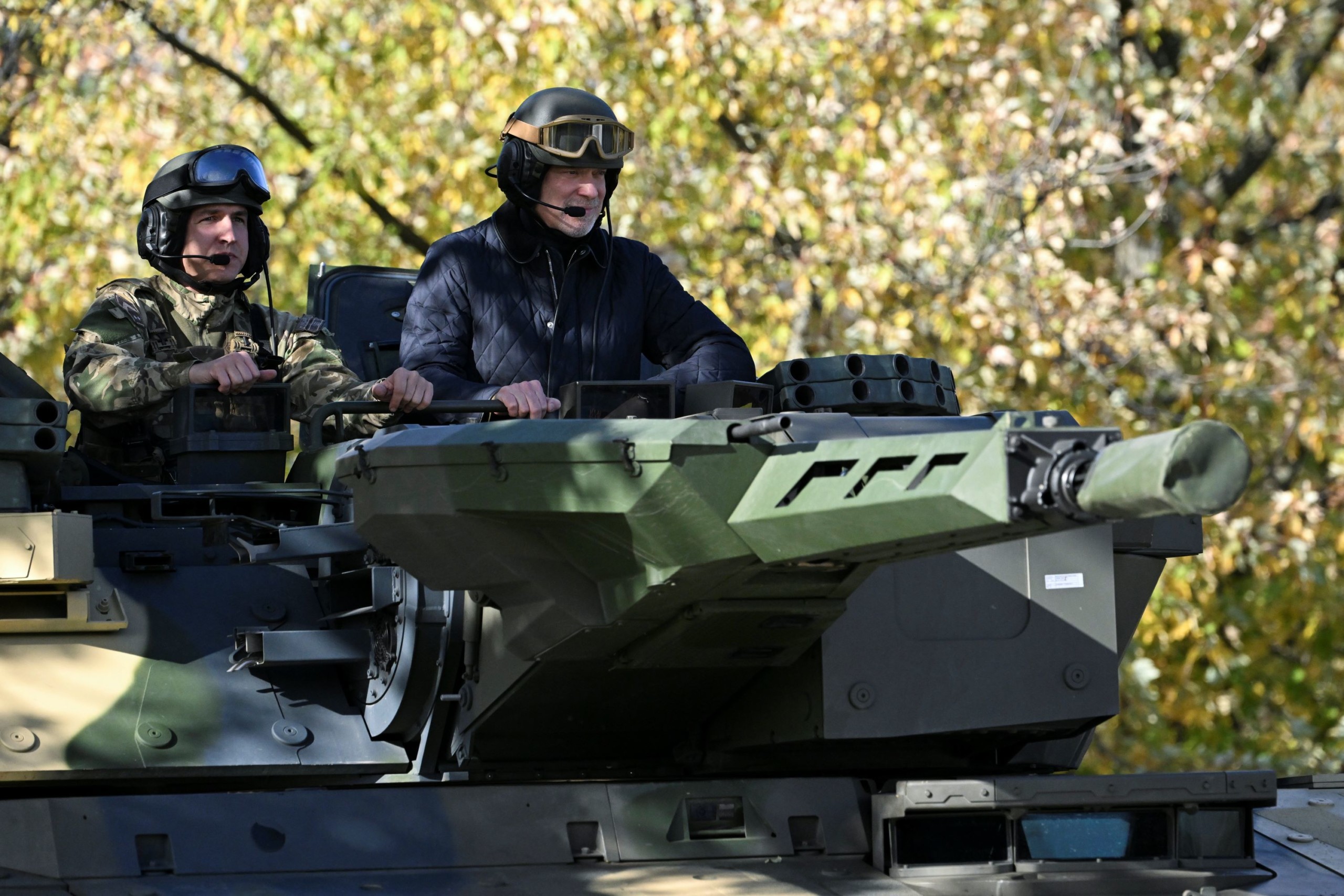 Szalay-Bobrovniczky Kristóf honvédelmi miniszter (j) egy Lynx páncélozott gyalogsági harcjárműben a NATO-erők részvételével megrendezett Adaptive Hussars 23 többnemzeti országos gyakorlat megnyitóján a hódmezővásárhelyi Zrínyi Miklós Laktanyában 2023. november 7-én. Fotó: MTI/Koszticsák Szilárd
