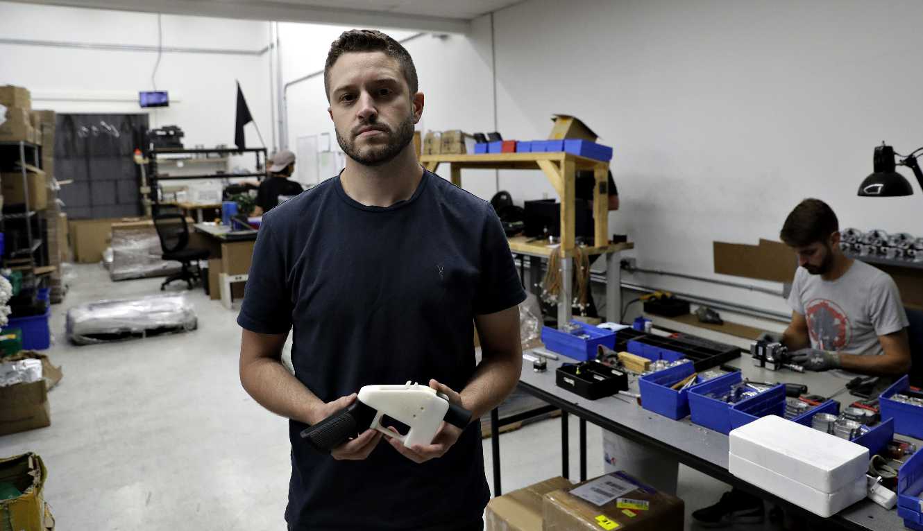 Cody Wilson, a Defense Distributed cég alapítója mutatja a Liberator nevű, az internetről 3D-ben, azaz térben kinyomtatható fegyvert az austini boltjában 2018. augusztus 1-jén. Augusztus 3-án újabb 11 állam csatlakozott a a 3D-ben nyomtatható fegyverek forgalmazását betiltó perkérelemhez, amelyet még július 30-án nyújtottak be a Seattle-ben lévő szövetségi bíróságra 8 állam és a szövetségi főváros, Washington DC főállamügyészei. Az első letölthető és térben kinyomtatható tűzfegyvert Cody Wilson 2013-ban mutatta be. (MTI/AP/Eric Gay)