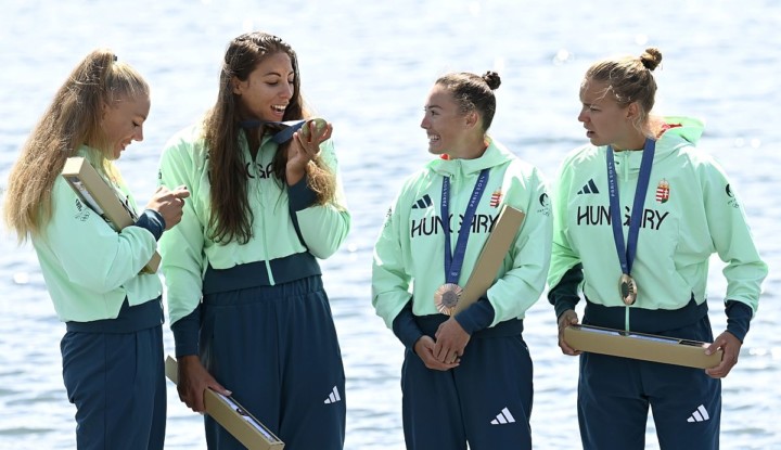 Címlapkép: A bronzérmes Gazsó Alida Dóra, Csipes Tamara, Fojt Sára és Pupp Noémi (b-j) a női kajak négyesek 500 méteres versenyének eredményhirdetésén a 2024-es párizsi nyári olimpián a vaires-sur-marne-i evezős és kajak-kenu pályán 2024. augusztus 8-án. (Fotó: MTI/Kovács Tamás)