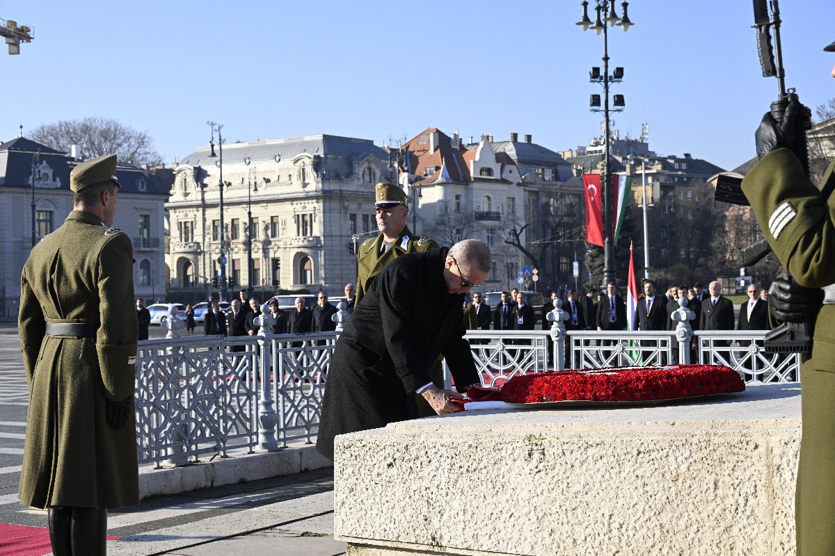 Ezek után Erdogan a Hősök terére látogatott, ahol Novák Katalin köztársasági elnök várta, és Csák János, Bóka János, Orbán Balázs, Szalay-Bobrovniczky Kristóf és Pintér Sándor is fogadta. A török elnök ezt követően magyarul köszönt a katonáknak, majd megkoszorúzta az első világháborús Hősök Emlékkövét.