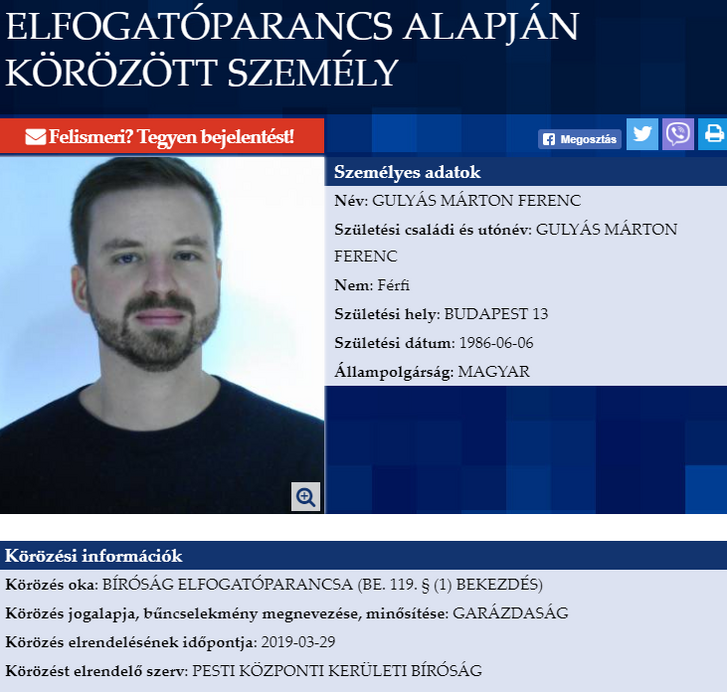 Az aktivista ügyvédje, dr. Matlák Gábor az Indexnek adott tájékoztatása szerint Gulyás ellen egy 2016-os városligeti tüntetésen történtek miatt indítottak eljárást, az építkezést eltakaró geotextil védőtakaró megrongálása miatt gyanúsították garázdasággal. Az eljárás alatt pár hónappal ezelőtt nem ment el egy tárgyalásra, emiatt adtak ki körözést ellene.