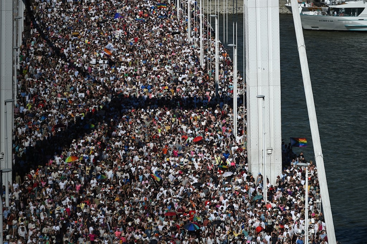 A jubileumi 30. Budapest Pride – immár „Budapest Büszkeség Menet” néven – szombaton délután 14 órakor indult a Városháza Parkból, a fővárosi önkormányzat és a Szivárvány Misszió Alapítvány közös szervezésében. Karácsony Gergely főpolgármester is ott volt, és 15 órakor a Műegyetem rakpartján felállított színpadon mondott beszédet, mely szerint „a szabadságot és a szerelmet nem lehet betiltani” . Bár a Mi Hazánk hídfoglalása miatt a menet az Erzsébet hídon kelhetett át Budára, a hivatalos tilalom és Orbán Viktor kritikai megjegyzése ellenére ez vált Magyarország eddigi legnagyobb Pride-jává. Forrás: 24.hu / Fotó: AFP