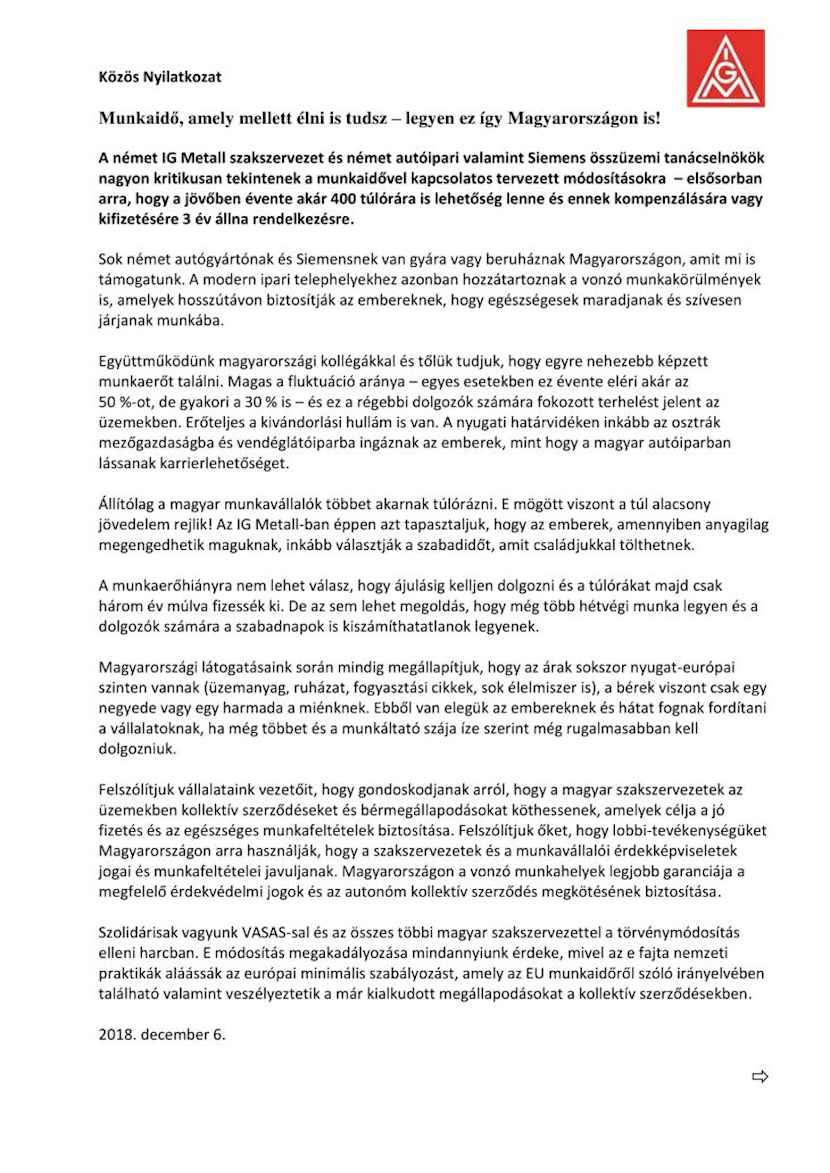A Vasas Szakszervezeti Szövetséghez eljuttattatott „Munkaidő, amely mellett élni is tudsz – legyen ez így Magyarországon is!” címet viselő nyilatkozatukban is látszik, hogy gondosan tanulmányozták a németek az idehaza kialakult helyzetet.