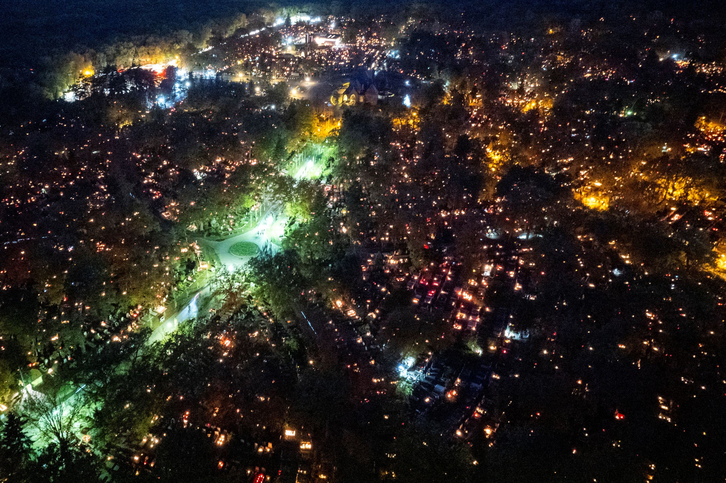 Drónfelvételeken, ahogy gyertyák világítják be a temetőket mindenszentek ünnepén